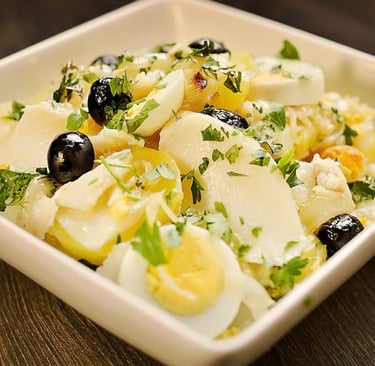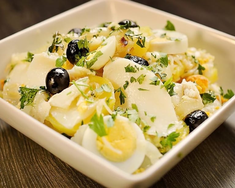 Bacalhau à Gomes de Sá, Criado por José Luís Gomes de Sá, comerciante do Porto, este prato leva bacalhau desfiado, batatas, cebolas, ovos cozidos e azeitonas pretas. Um clássico elegante e reconfortante.